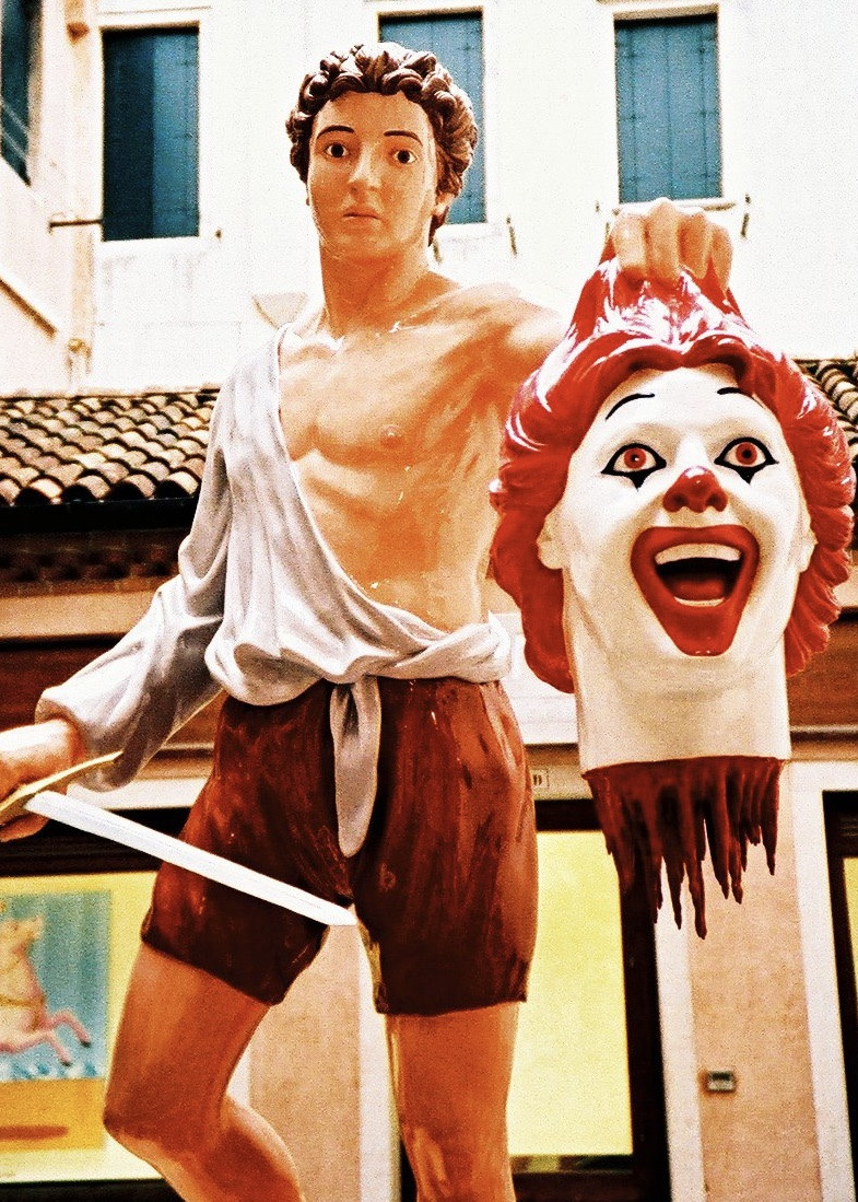 Whether depicting Mussolini’s severed head (Occidente, Occidente) or painting cartoon heroines in sexually ambiguous positions, Veneziano's art often blurs the line between satire and sacrilege.
