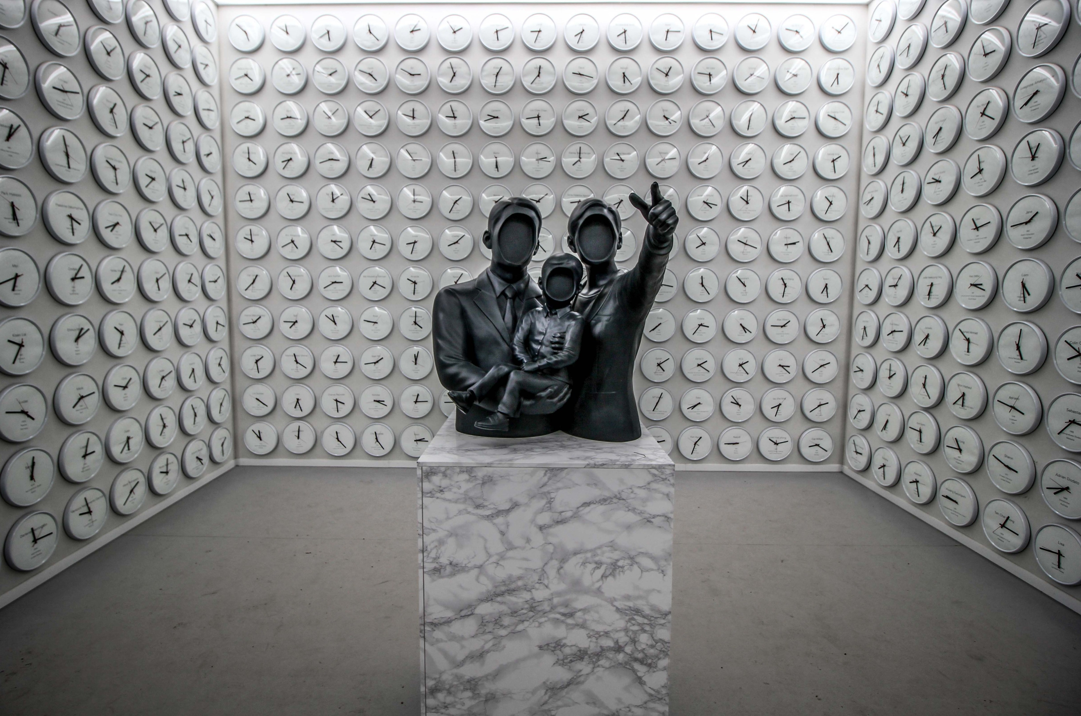 In the center of the room stands a dark statue titled "For a Better Tomorrow." The sculpture depicts a family – father, mother, and child – united in an idealized pose reminiscent of socialist monuments. However, the faces of the figures are cut out, rendering them faceless and anonymous. This abstraction raises the question of whether, in today's society, we are defined solely by our roles and time, and whether we have lost our true identity as a result.